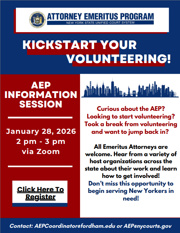 For more details, please see the flyer below. If you have any questions or need assistance, please contact AEP Coordinators at AEP@nycourts.gov or aepcoordinator@fordham.edu.